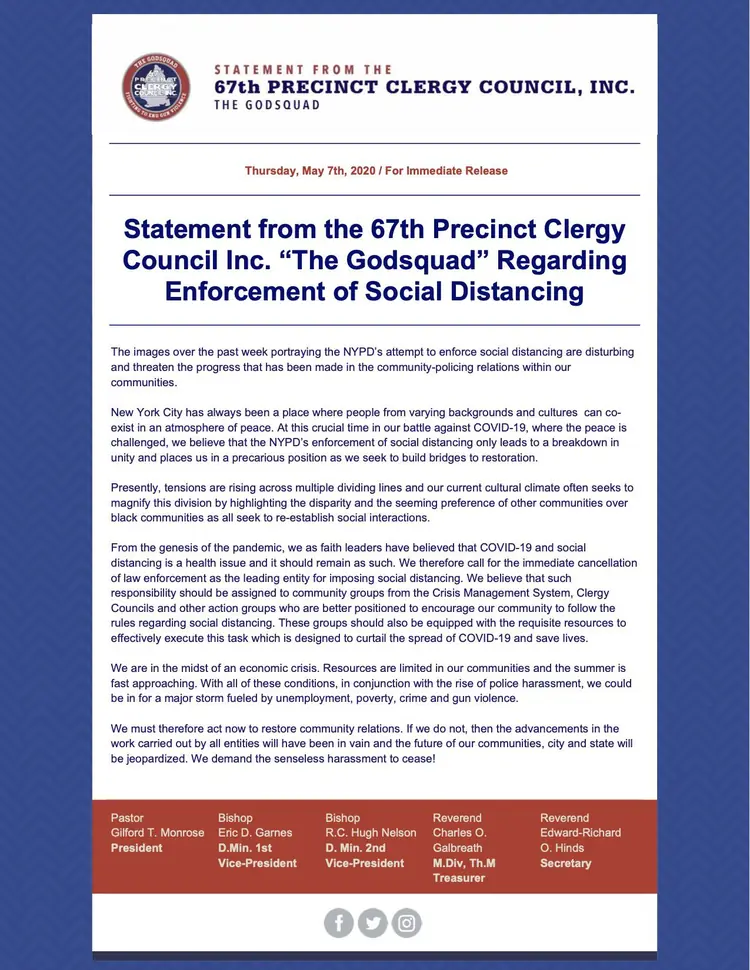 Statement from the 67th Precinct Clergy Council, INC. "The GodSquad"